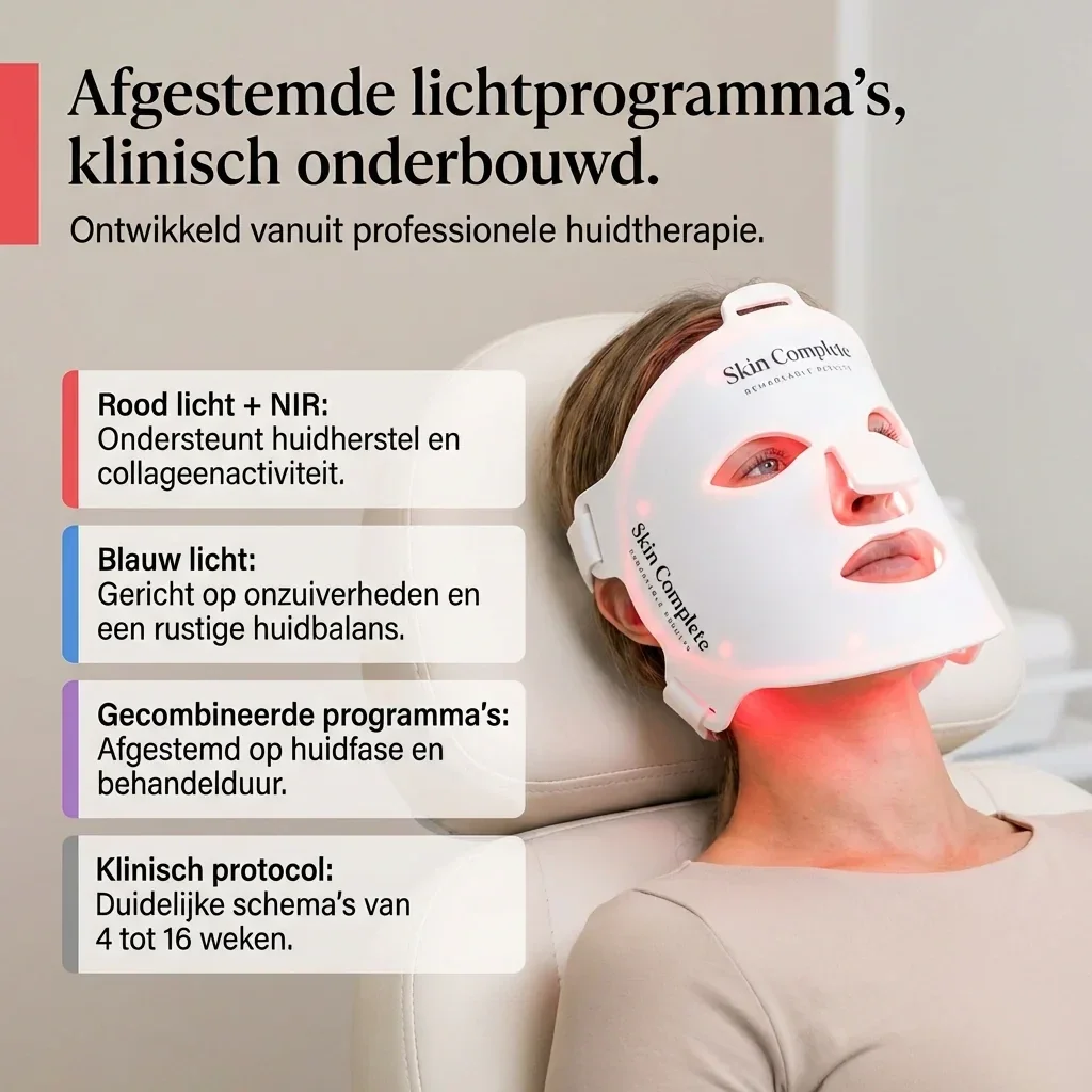 Stel je voor: dagelijks toegang tot geavanceerde LED-therapie, op een verantwoorde en professioneel begeleide manier, gewoon bij jou thuis. De Skin Complete PREMIUM LED-MASK is ontwikkeld als hoogwaardig thuisapparaat dat professionele huidbehandelingen ondersteunt en helpt verlengen.